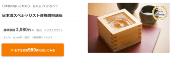 | 日本酒スペシャリスト | × | 在宅・随時 | 月額3,980円 | ・初心者向け ・formieで受講・受験 |